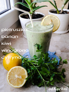 1. Do blendera wlewamy kefir. Dodajemy banana, kiwi, winogrona, pietruszkę i sok z cytryny. Blendujemy i gotowe 🙂