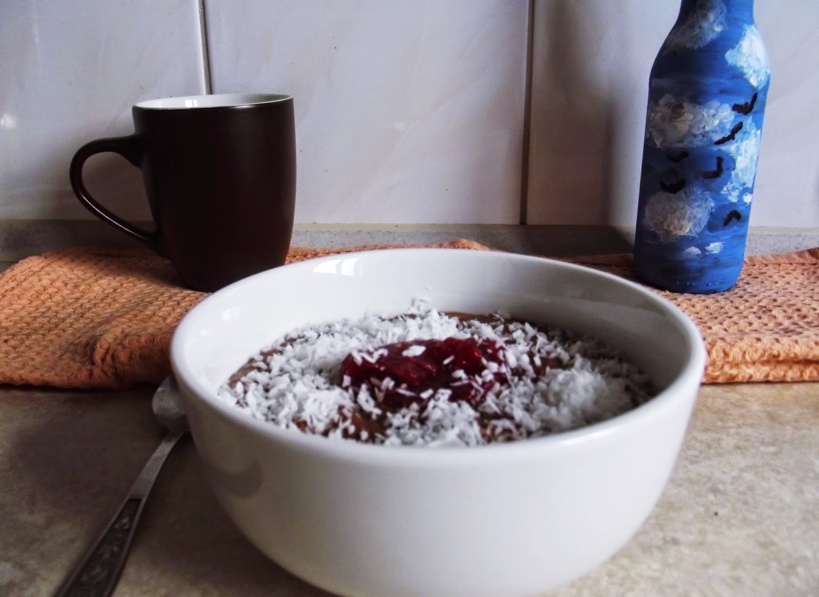 mroczny las, czyli owsianka z siemieniem lnianym, cynamonem, dżemem malinowym, gorzką czekoladą i wiórkami kokosowymi
