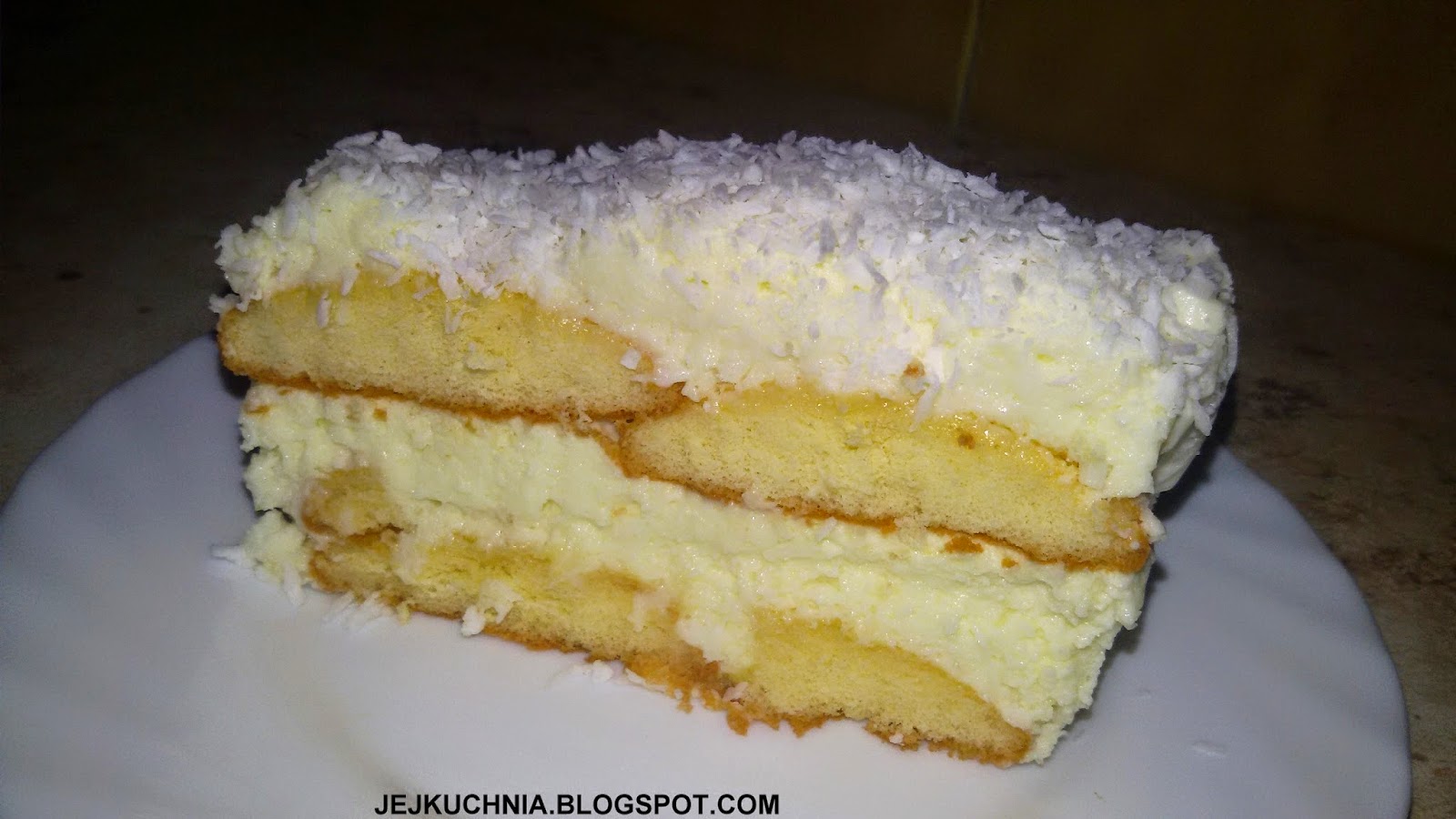 Składniki:660 ml śmietany 30%,2 śnieżki,2 galaretki cytrynowe,2 białe czekolady,opakowanie wiórków kokosowych (200 g),około 350 g okrągłych biszkoptów.
