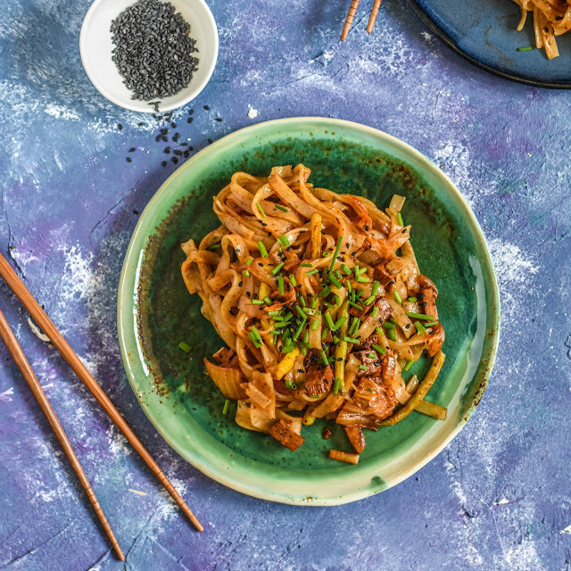 Makaron z kimchi, fasolką szparagową i tofu (lub kurczakiem), który będzie smakował…