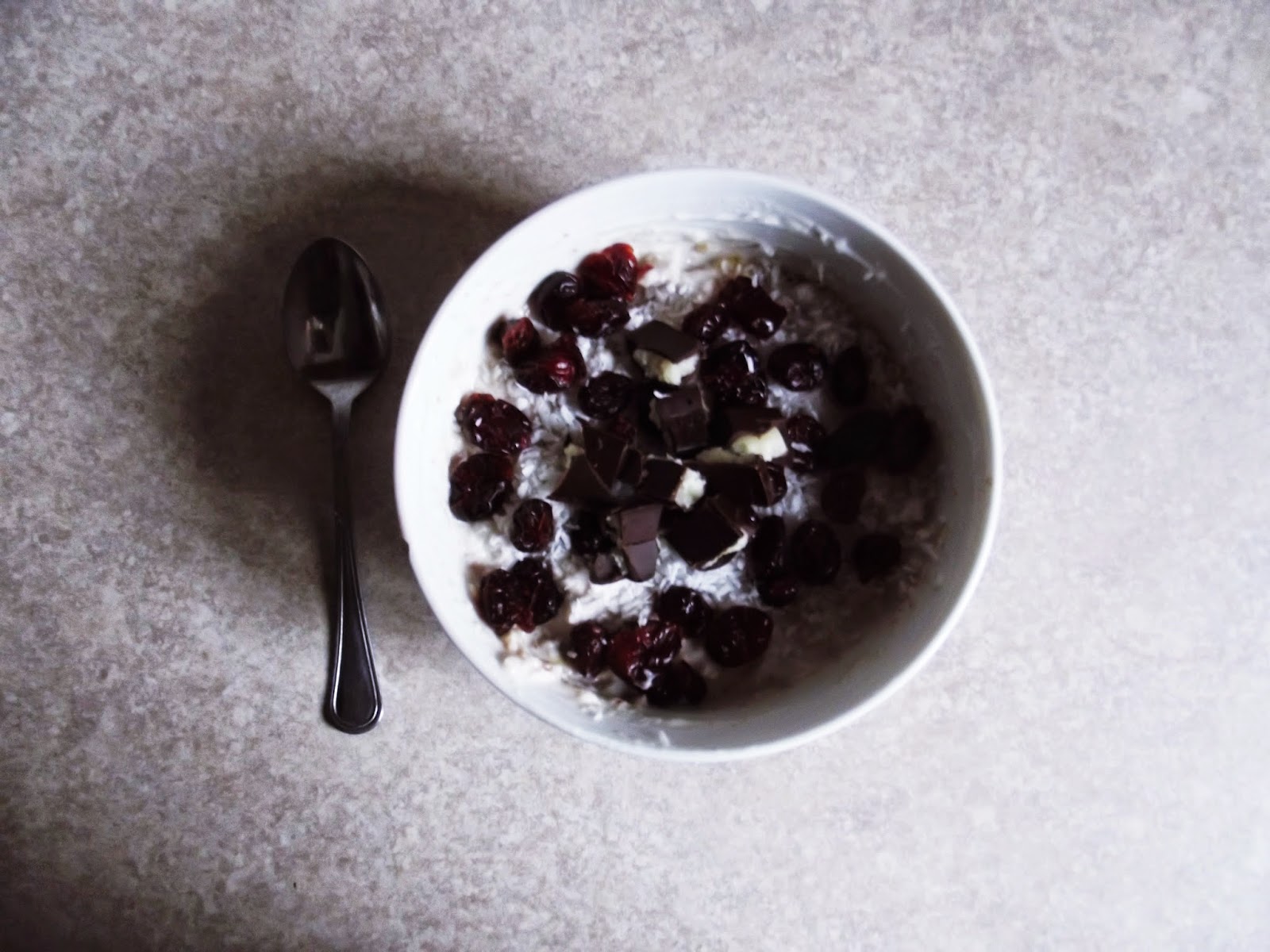 jogurtowa* owsianka z siemieniem lnianym, wiórkami kokosowymi, suszoną żurawiną i marcepanową czekoladkącream cheese oatmeal with linseed, desiccated coconut, dried cranberries and marzipane chocolate