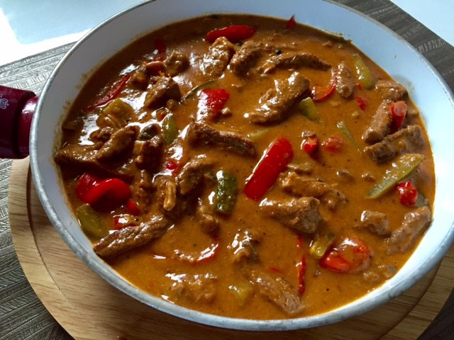 Klasyczny Boeuf Strogonow Rozgrzewający, pożywny i przepyszny gulasz wołowy z pieczarkami, papryką…