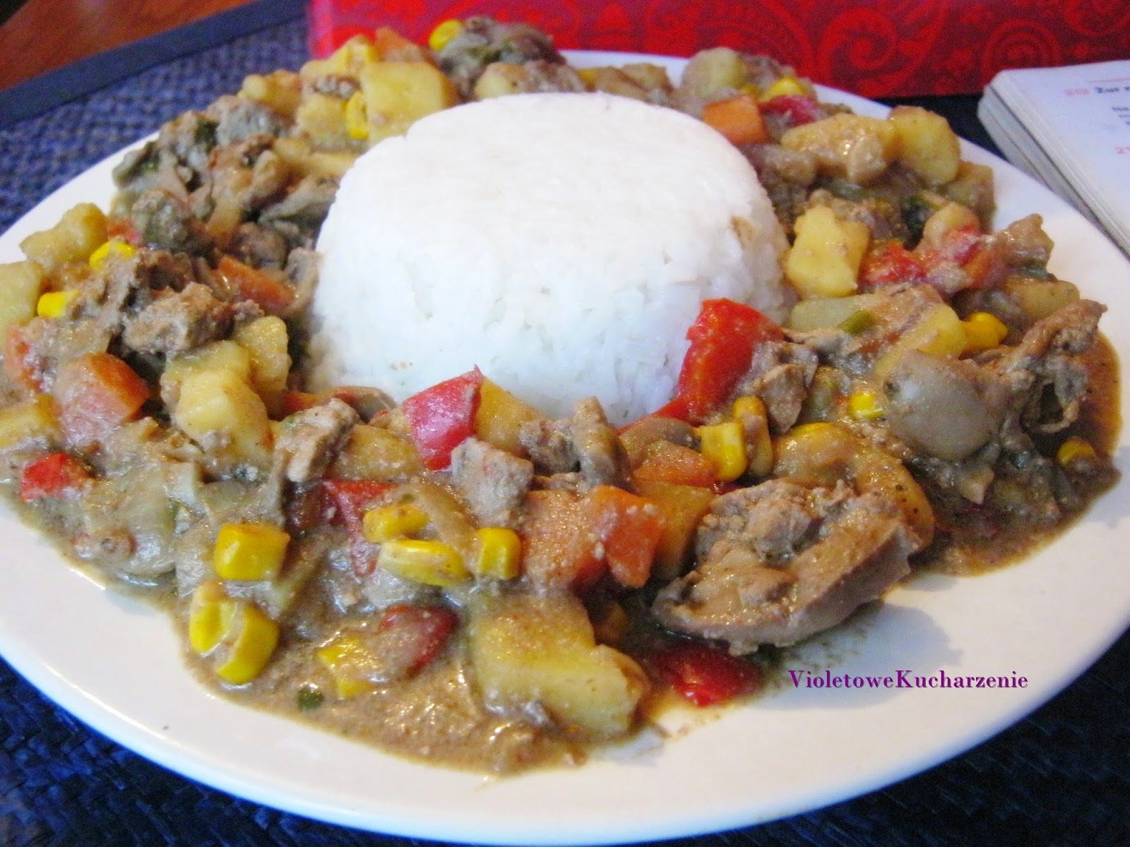 500 g wątróbki drobiowejPrzyprawa do mięsa1 czerwona papryka1 żółta papryka285 g kukurydzy (1 puszka)6 dużych pieczarek1 marchew6 ziemniaków2 cebuleOstra czerwona paprykaSłodka czerwona paprykaSólPieprz1 szklanka