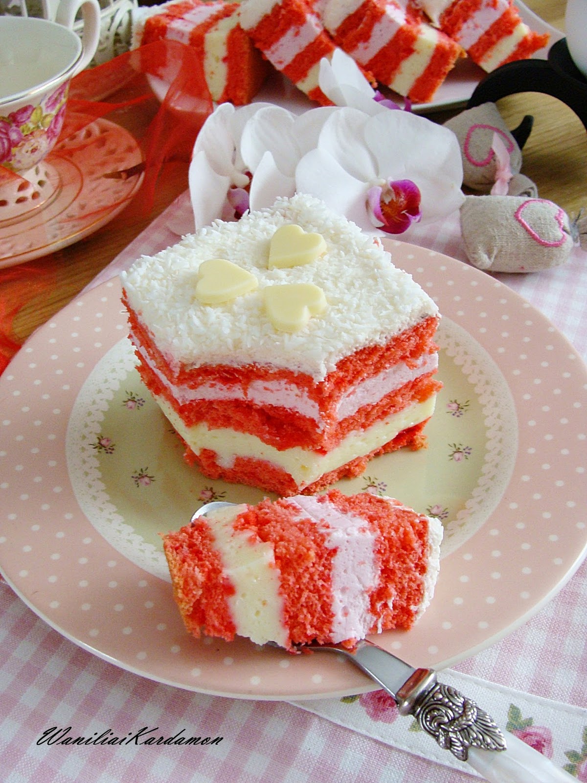 Prosty zwyczajny biszkopt w kolorze miłości z puszystą pianką wewnątrz na bazie śmietanki i mleka skondensowanego, tworzy pyszną całość, jest lekkie i efektowne, na zbliżające się walentynki w sam raz.