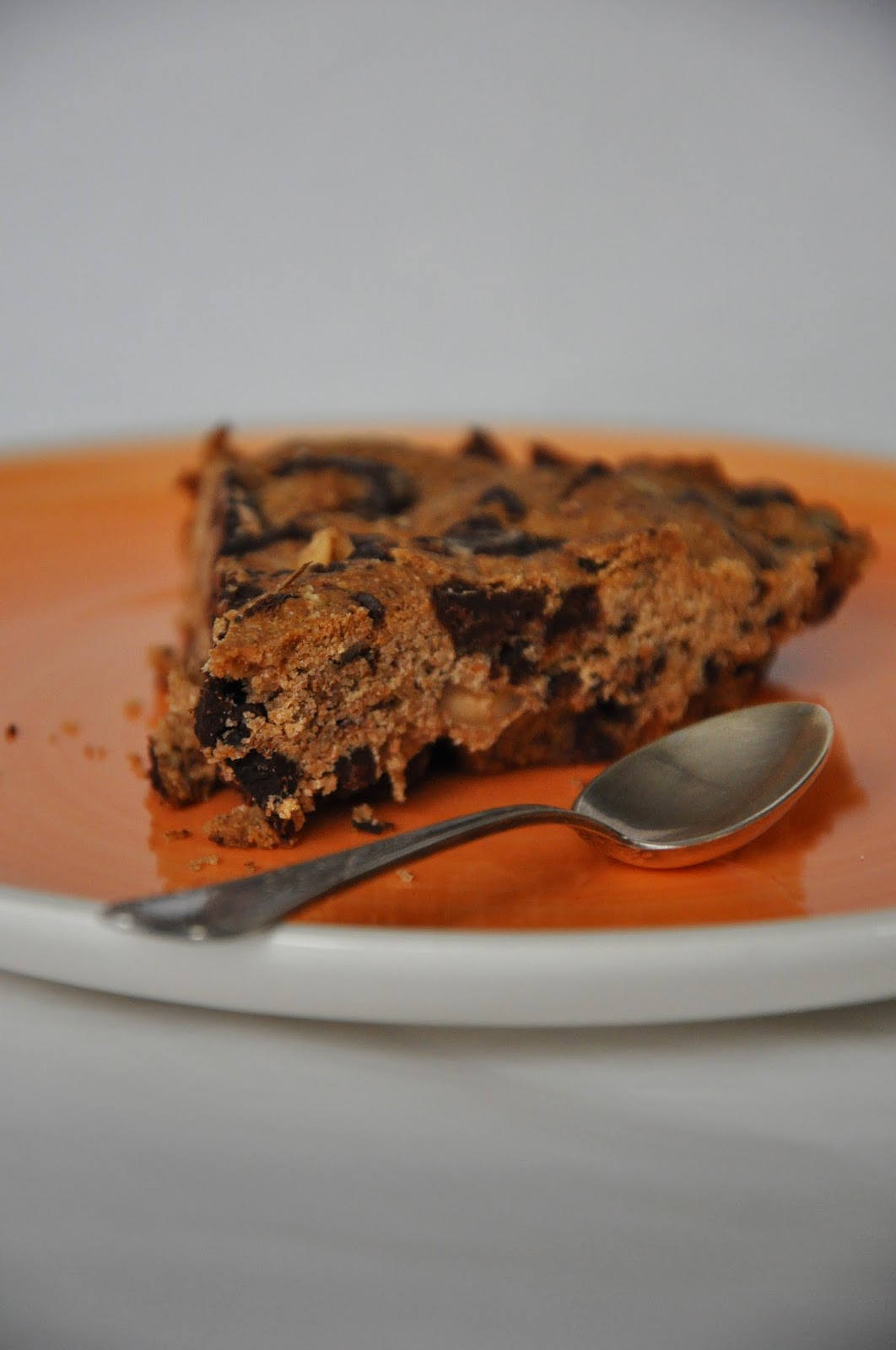 Jest to zdrowsza, myślę, że nawet smaczniejsza wersja Chocolate chip cookie cake. Z dodatkiem orzechów laskowych, mąki gryczanej oraz mąki graham. Ciasto nie zawiera normalnego cukru, słodyczy dodaje mu za to niewielka ilość miodu. Robi się je bezproblemowo i szybko.