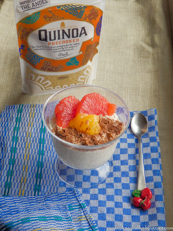 Quinoa* overnight na bazie bananowej ricotty podana z lemon curd, różowym grejfrutem i wegańskimi miętowymi płatkami czekolady * użyłam komosy wstępnie ugotowanej (Paul’s Quinoa)