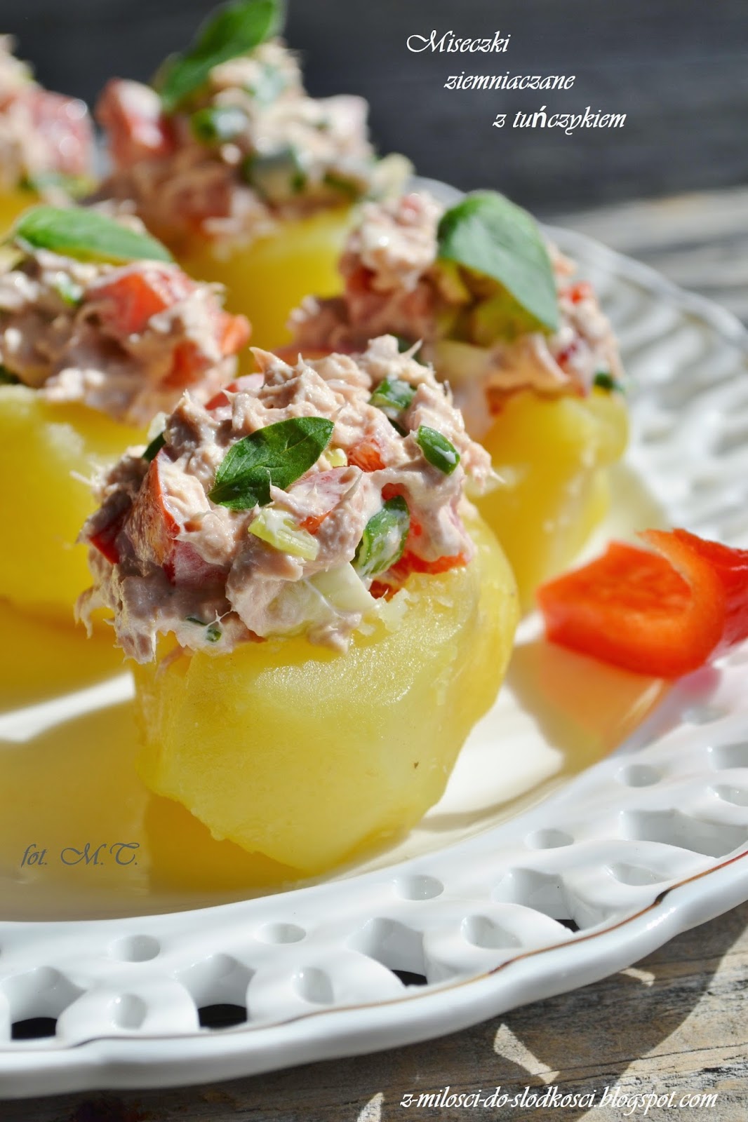 Ostatnio na blogu pojawiało się dużo słodkich wpisów, dlatego dziś mam dla Was zupełnie inną propozycję. Ziemniaki nadziewane masą z dodatkiem tuńczyka, świetnie sprawdzą się jako piątkowy obiad a także jako przekąska podczas spotkania ze znajomymi. Farsz oczywiście można dowolnie modyfikować:)
