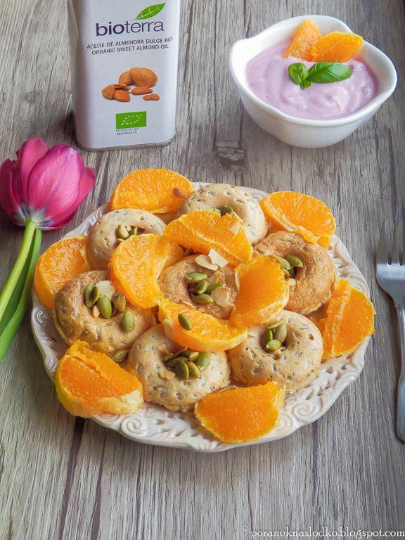Potrójnie migdałowe donuty z pszenicy farro bio podane z mandarynką, pestkami dyni…