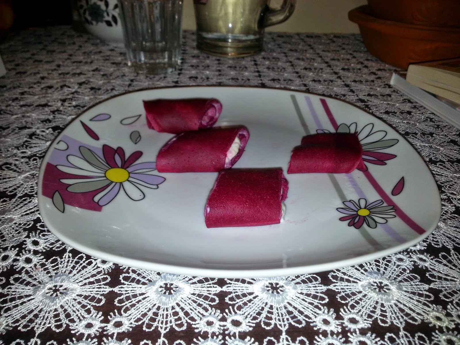 Jakąś odmiana kolorystyczna zwykłych naleśników? Osobiście wydała mi się bazie interesująca i przede wszystkim niezwykle smaczna! 🙂 czas na różowe, a nawet purpurowe naleśniki ze szpinakiem. U nas podane z musem z banana i serka naturalnego.