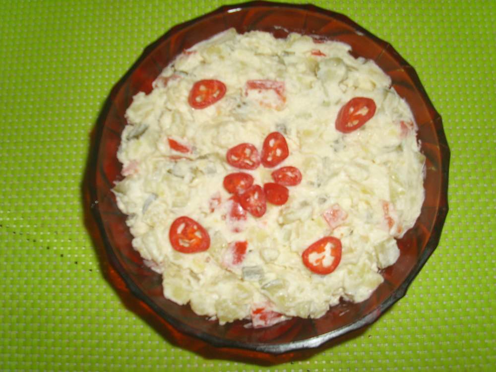 Ziemniaki obieramy i kroimy w kostkę. Paprykę i ogórki również kroimy w kostkę. Składniki przekładamy do miski, dodajemy majonez, posypujemy solą, pieprzem i mieszamy. Doprawiamy według swojego smaku żeby nie była mdła i zajadamy.Zostały mi ziemniaki z obiadu i ogórki po kartusku z papryka. Więc wymyśliłam sałatkę na kolację. Szybko, tanio i smacznie.