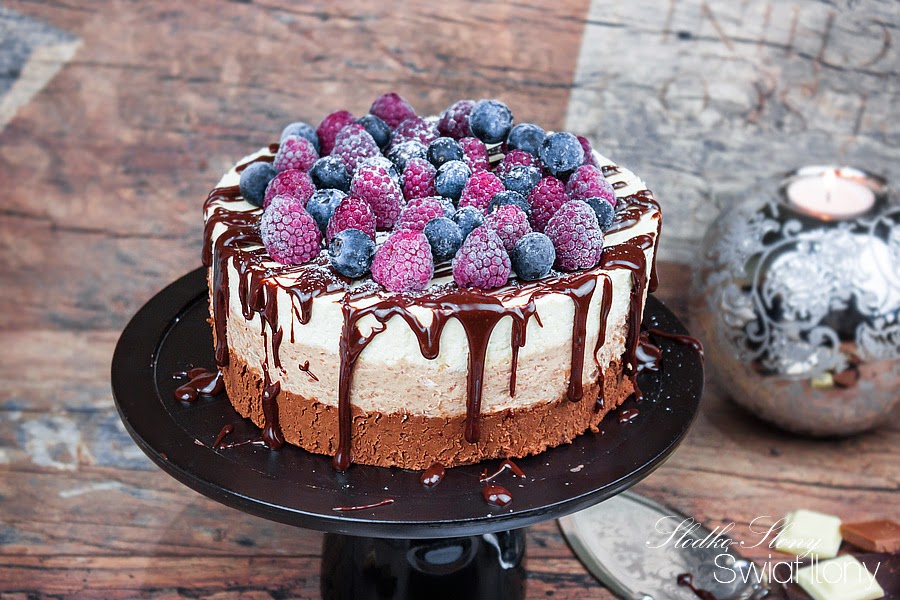 Cudowny, aksamitny sernik zrobiony z tony czekolady:) Zużyłam aż 6 (!!!) tabliczek, także sernik zaspokoi ochotę na nią na dłuuugo:)) Sernik składa się z trzech kuszących, rozpływających się w ustach musów z gorzką, mleczną i białą czekoladą, na bazie serka naturalnego, mascarpone i kremówki.