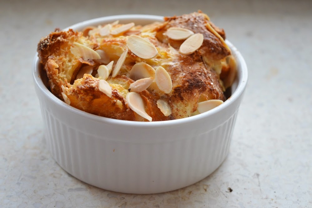 pudding chlebowy z croissanta, z cynamonem, płatkami migdałów, syropem klonowym i muscovado