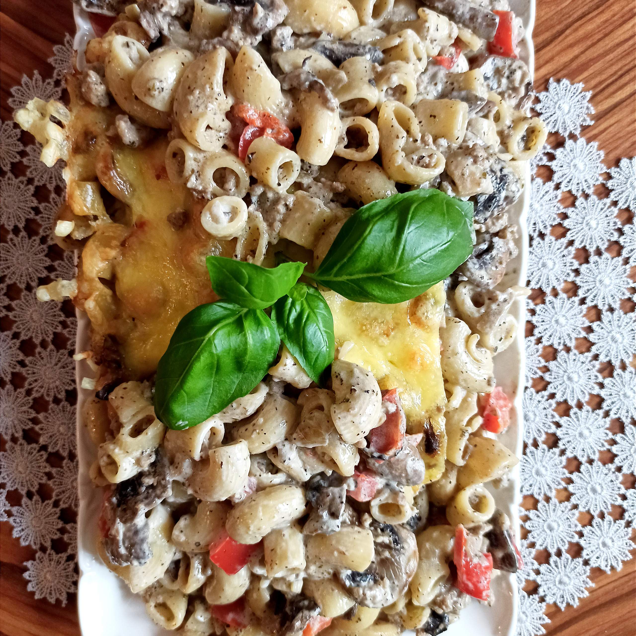 Pyszna, sycąca zapiekanka makaronowa z mięsem mielonym, pieczarkami, papryką i sosem śmietanowym…