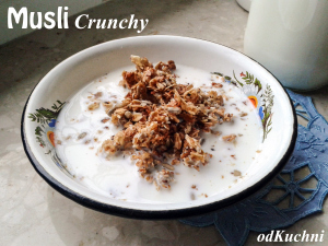 1. Na suchej patelni podprażamy płatki z nasionami, pestkami, orzechami, owocami suszonymi. Dodajemy 3 łyżki miodu lub więcej jeśli wolicie słodsze. Dokładnie mieszamy. Przekładamy do foremki (najlepiej silikonowej wtedy najłatwiej można