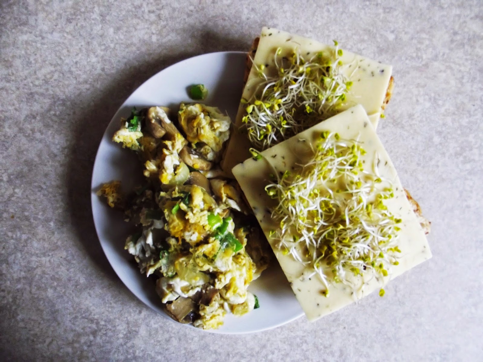 jajecznica* z pieczarkami, cebulą i szczypiorkiem oraz pełnoziarnisty chleb tostowy z żółtym serem i kiełkami brokułascrambled eggs with mushrooms, onion, chives and wholegrain toast bread with hard cheese and shoots of sprouting broccoli