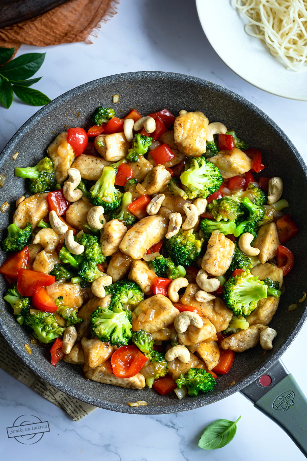 Kurczak z brokułem, cebulą i papryką w słodkim sosie. Podałam go razem…