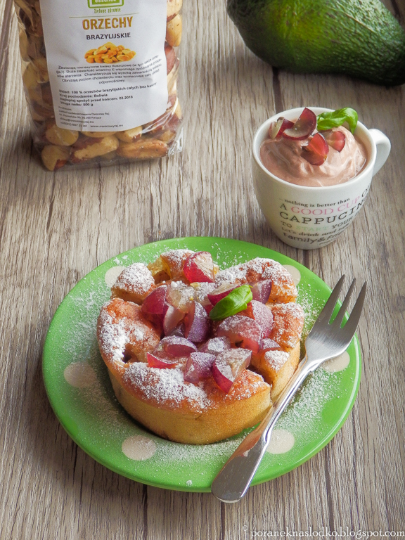 Drożdżowe ciastko z gruszkami i orzechami brazylijskimi podane z winogronami, domowym serkiem…