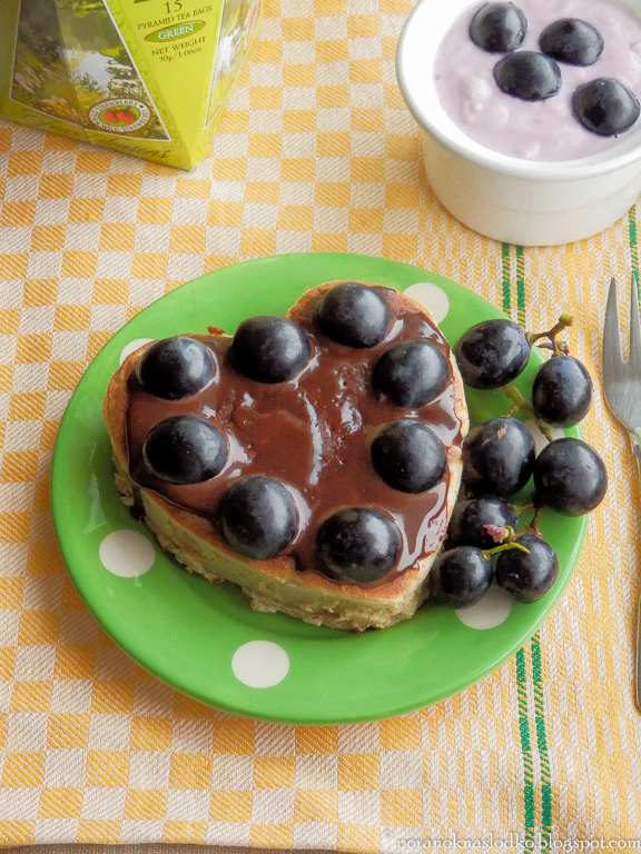 Drożdżowy placek amaretto podany z kremem nugatowym, ciemnymi winogronami i domowym serkiem borówkowym; hearbata Basilur Summer Tea