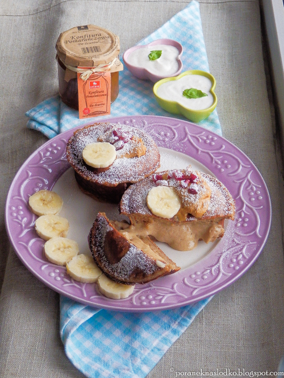 Kawowe babeczki gryczane nadziane kremem orzechowo-pomarańczowym* podane z masłem orzechowym, bananem, pestkami granatu, cukrem pudrem trzcinowym i jogurtem naturalnym