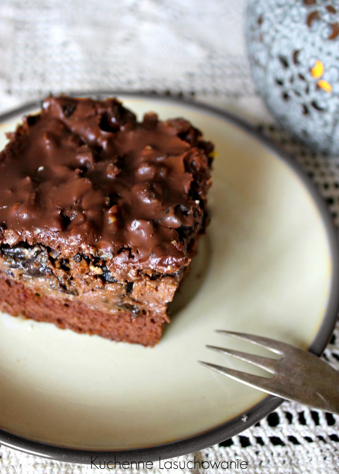 Pyszne, kremowe ciasto, które podbiło serce mojej babci podczas zeszłych świąt. Składa się z delikatnego, czekoladowego biszkoptu nasączonego aromatycznym ponczem z gorzkiej czarnej herbaty i rumu, na nim znalazł się budyniowy krem czekoladowy, wspaniałe w smaku, pachnące i mięciutkie śliwki, chrupiące orzechy oraz polewa czekoladowa.