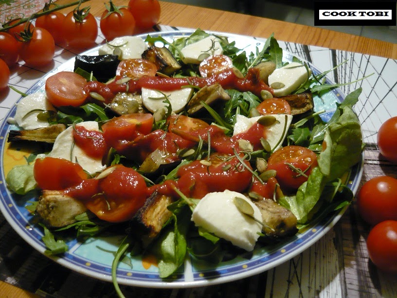 Hej! Klimaty śródziemnomorskie w prostej, zdrowej odsłonie! Bakłażan, rukola, sałata, pomidorki cherry, mozzarella i zdrowe dodatki – o to kolejna sałatkowa odsłona!. Sałatki dają możliwości ułożenia idealnego bilansu składników odżywczych, możemy wpakować w nie przeróżne dodatki które dzięki różnorodności – w pełni mogą zaspokoić zapotrzebowanie choćby na witaminy i minerały.