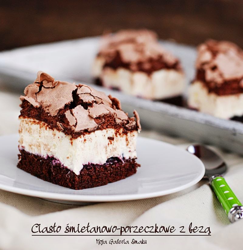 Śmietanowo-porzeczkowe ciasto z przepyszną czekoladową bezą. Polecam!