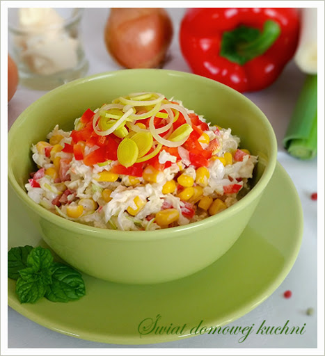 1 średnia kapusta pekińska1 puszka kukurydzy1/2 czerwonej papryki1 por (około 15 cm)280 g śmietany 12%1 łyżeczka musztardysólpieprzcukiersok z 1/4 soku z cytryny