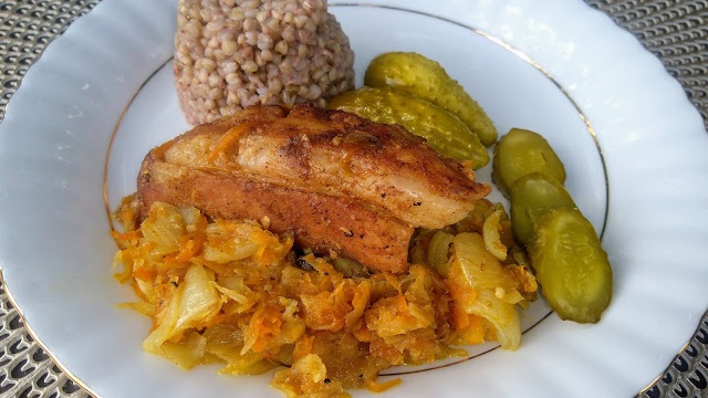 Składniki:1,5 kg kiszonej kapusty,0,5 małej główki kapusty białej,30 dag karkówki,3 żeberka z kością,1 udko z kurczaka lub indyka,4