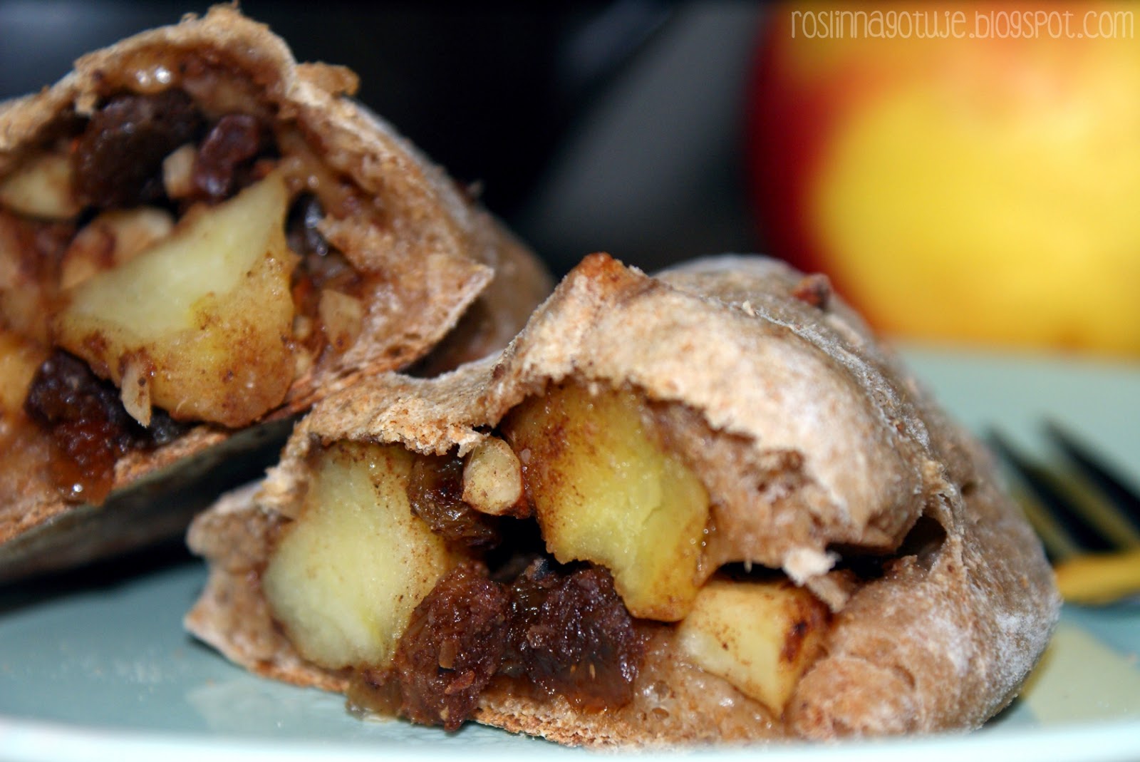 Pieczone jabłka z dodatkiem korzennych przypraw uwielbiam w każdej postaci, a w tej wersji smakują naprawdę cudownie! Słodkie rodzynki i chrupiące migdały świetnie dopełniają całość, a ciasto, mimo, że zrobione z mąki razowej, jest bardzo delikatne. Fajny pomysł na śniadanie, może niekoniecznie to zabiegane w tygodniu, prędzej na spokojny