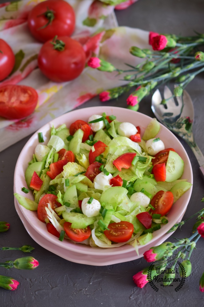 Lekka prawdziwie wiosenna sałatka z małymi kuleczkami mozzarelli i miodowym winegretem, do…