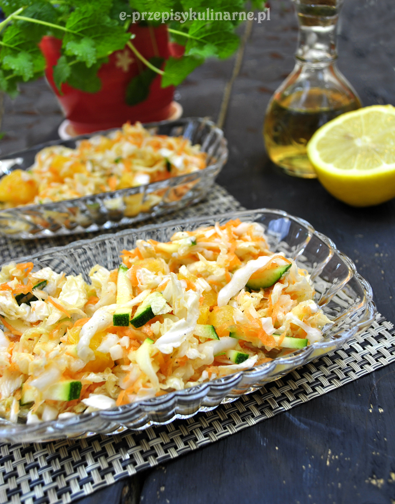 Kapustę szatkujemy, posypujemy solą, lekko wygniatamy rękami i odstawiamy na 15 min. Pomarańczę obieramy, dzielimy na