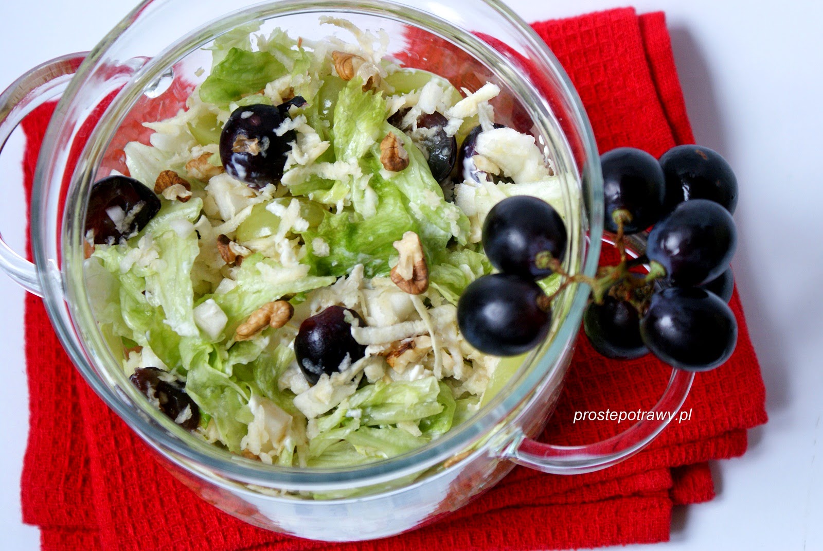połowa małej sałaty lodowejmały świeży seler1 jabłkogarść winogron ciemnych i jasnych2-3 łyżki pokruszonych orzechów włoskichmajonez połączony ze śmietanąsok z cytryny