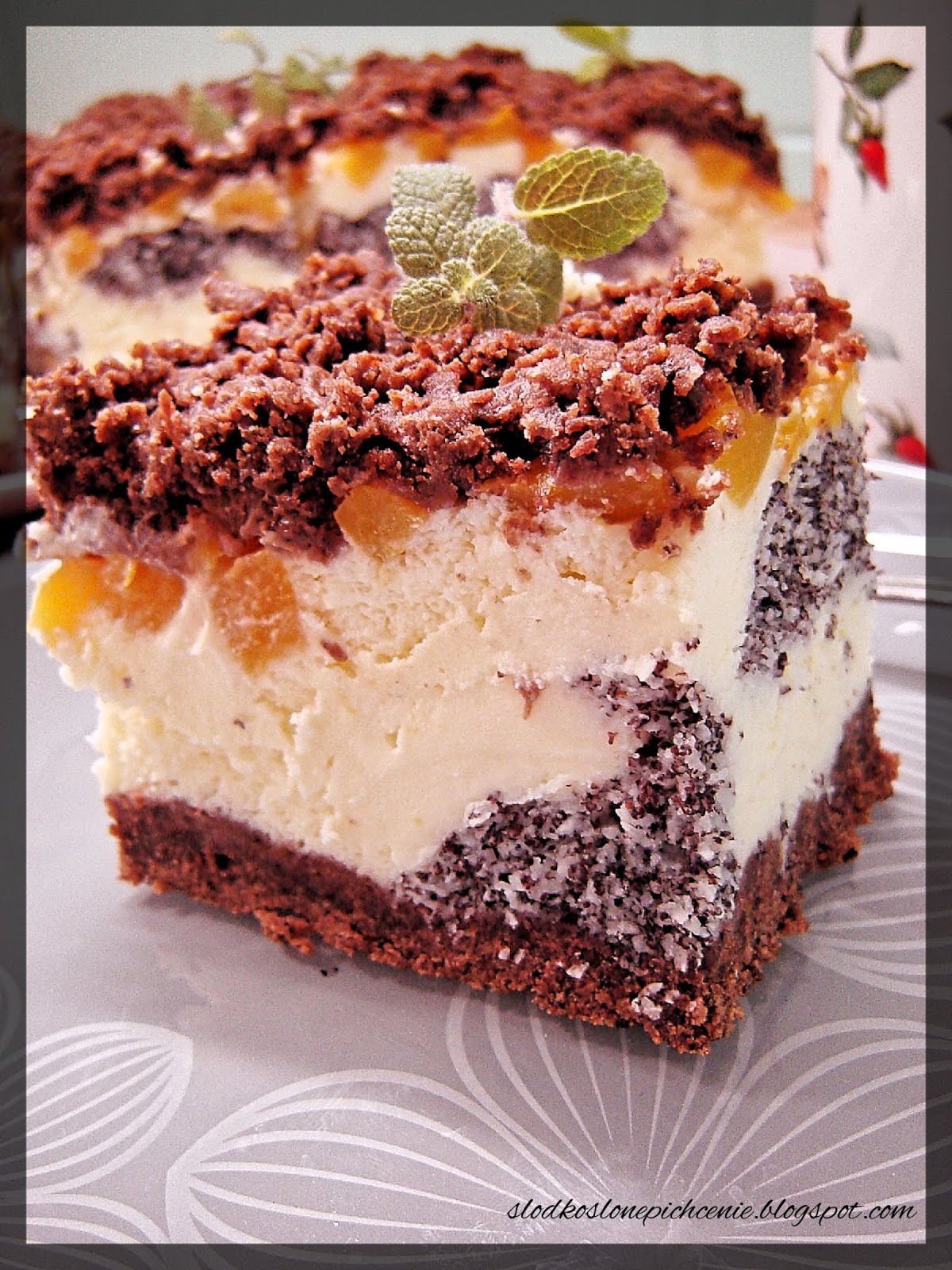 Sernik na kakaowym, kruchym cieście z dodatkiem lekkiej, piankowej warstwy makowo-kokosowej, którą…