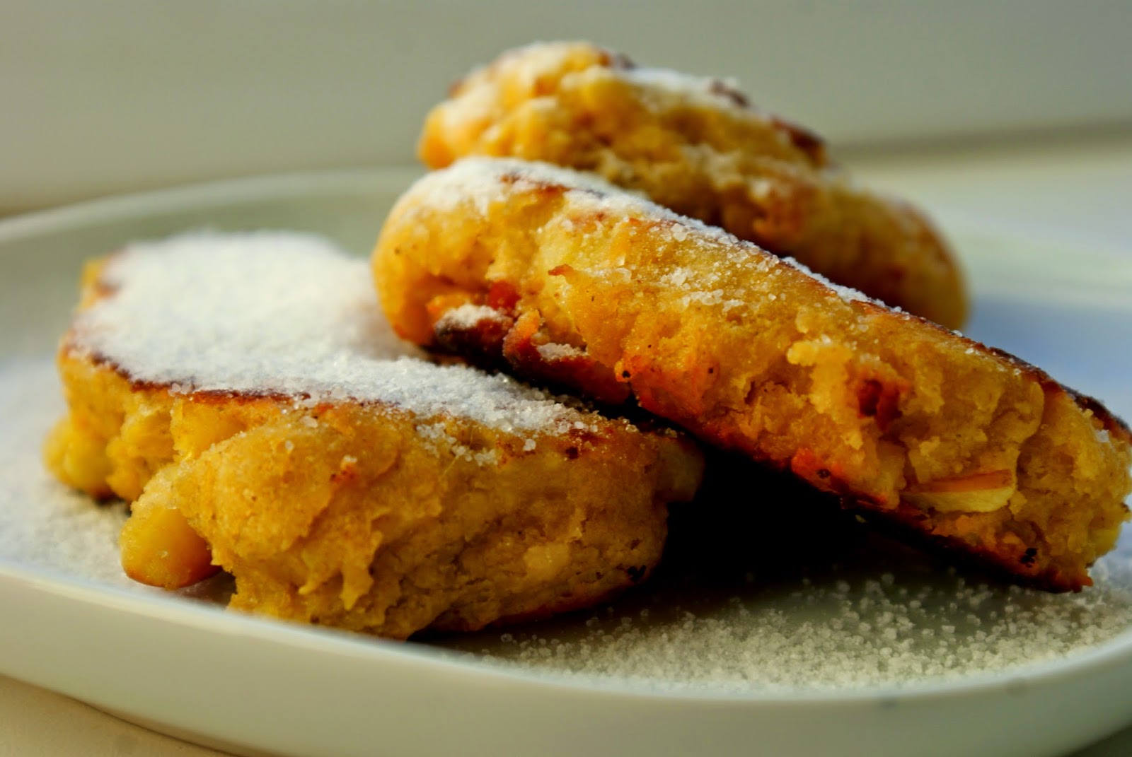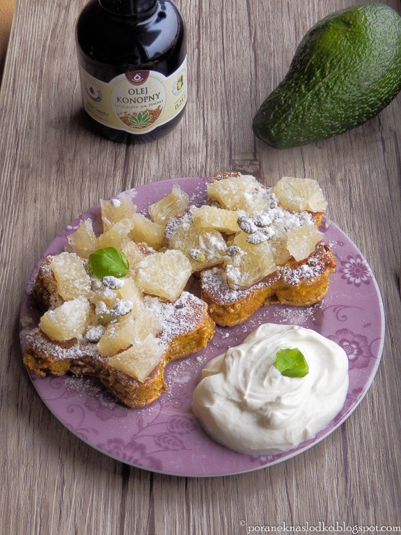 Gwiazdki z ciecierzycy podane z migdałowym serkiem konopnym*, cukrem pudrem trzcinowym, pomelo i pestkami dyni* serek naturalny + ekstrakt migdałowy + łyżka syropu z agawy + łyżeczka oleju konopnego