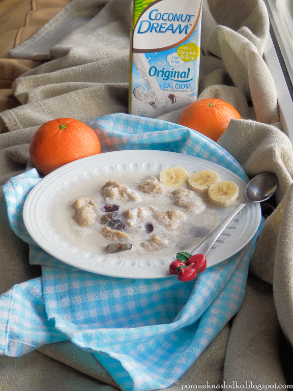 Kokosowo-migdałowe kluski kładzione na mleku kokosowo-ryżowym podane z bananem i winogronami