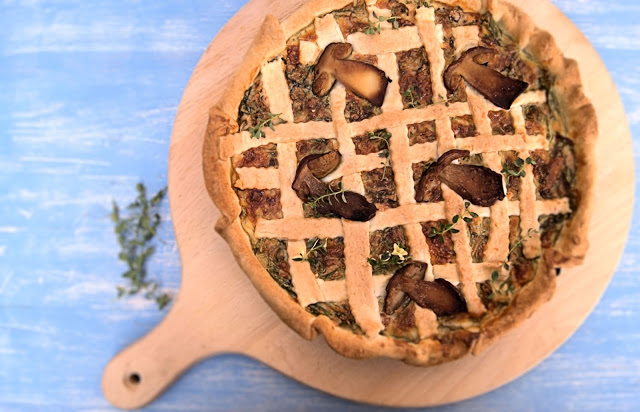 Jesienna tarta ze szpinakiem, grzybami i chorizo, do przygotowania z grzybów leśnych…