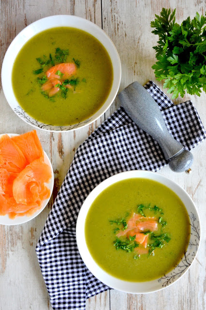 Zielona zupa z brokuła, cukinii i ziemniaków podana z wędzonym łososiem i natką pietruszki