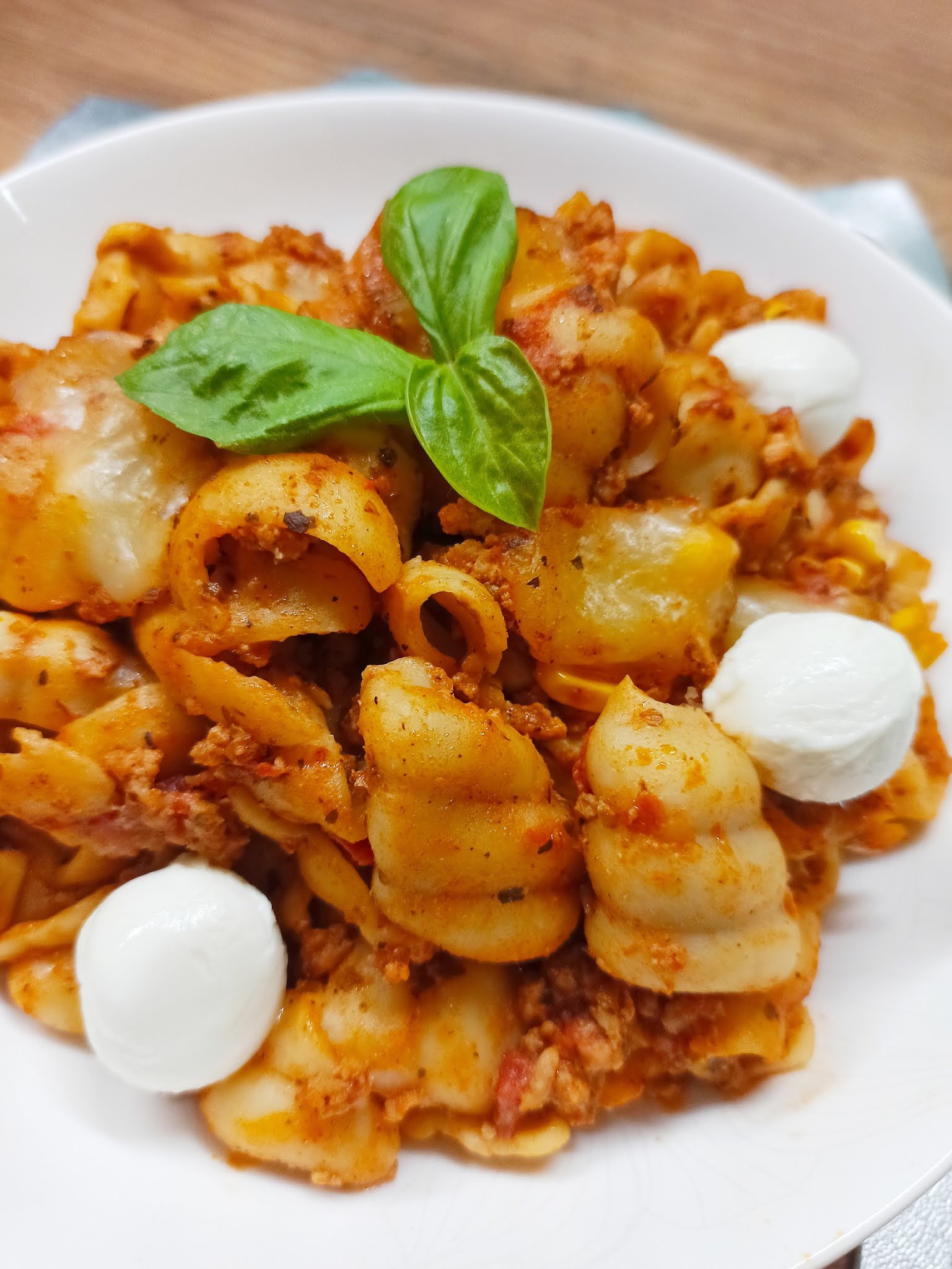 Makaron z ekspresowym w przygotowaniu sosem pomidorowym z mięsem mielonym, kukurydzą i…