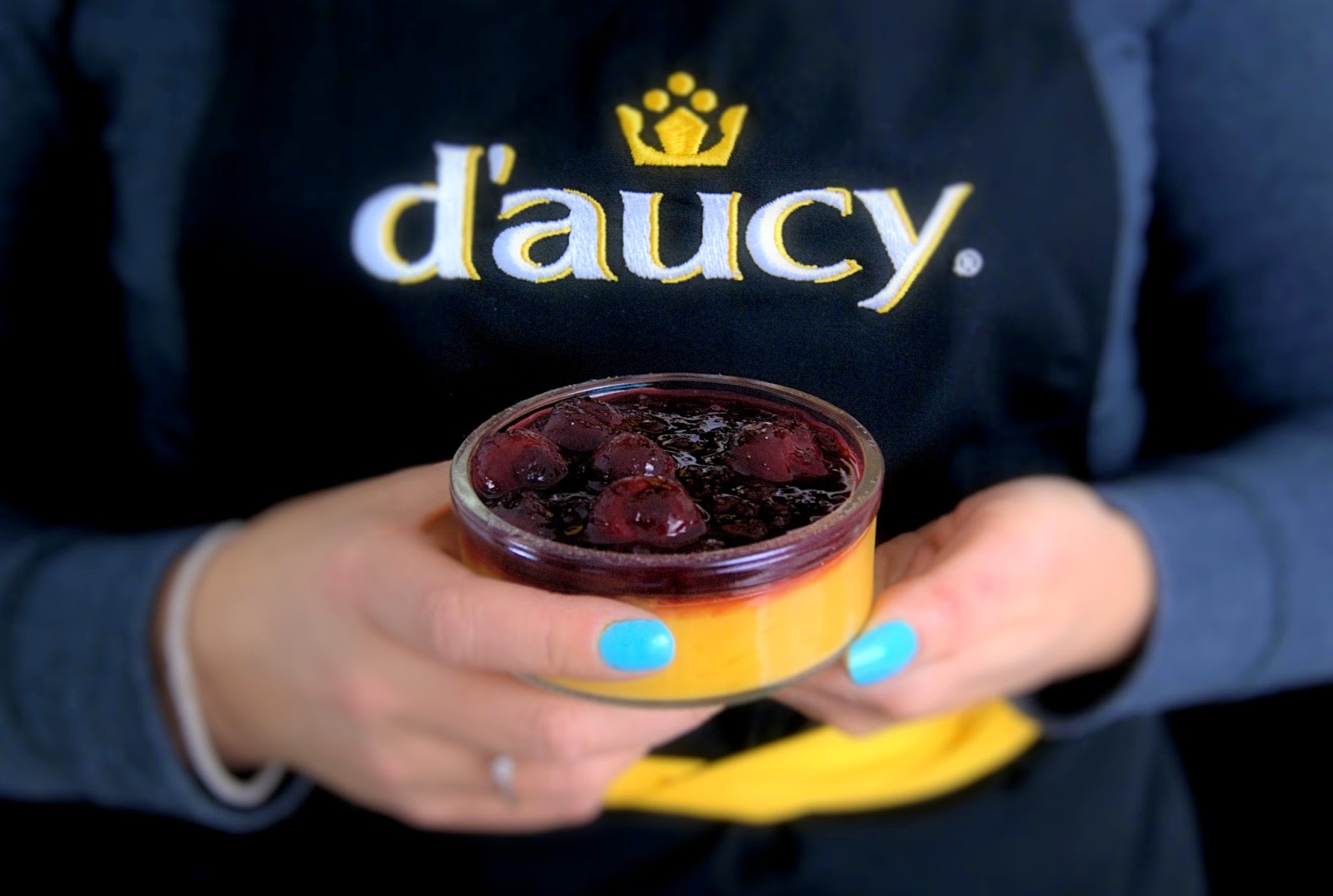 Krem batatee to moja wariacja nt. kremu brulee. Przygotowuję go z wyjątkowych i zdrowych batatów, które tworzą intensywnie pomarańczowe zestawienie z pomarańczą. Dla kontrastu sos wiśniowy z dużymi kawałkami owoców z dodatkiem wiśniówki (alkohol odparuje w trakcie gotowania). Agar-agar, roślinny środek żelujący, pozwala przygotować znakomity deser wegetariański.