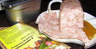 łopatka bez kości 65 dag, boczek parzony 15 dag, peklosmaczek K 2 płaskie łyżeczki, przyprawa Szeherada 3 łyżeczki, żelatyna wieprzowa 2 łyżeczki, woda zimna 200 ml