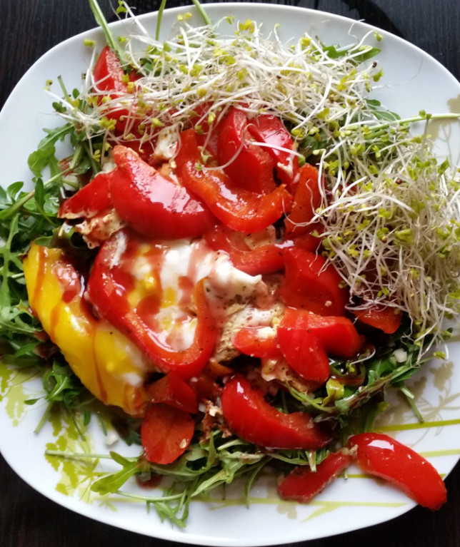 Jem zdrowo: Rukola z papryką i jajkiem Drukuj przepis Składniki2 garści rukoli0,5 średniej papryki1 garść kiełków1 średnie jajko2 łyżki startej mozzarelli ulubione przyprawy1 łyżeczka