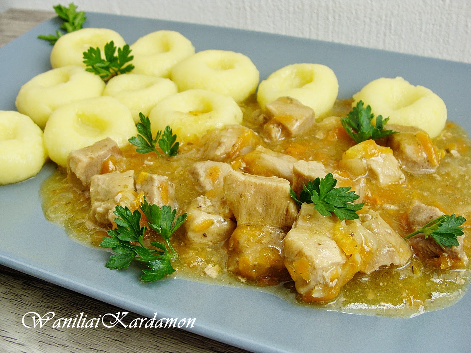 Kluski śląskie podane z pysznym duszonym mięsem z szynki wieprzowej i warzyw…