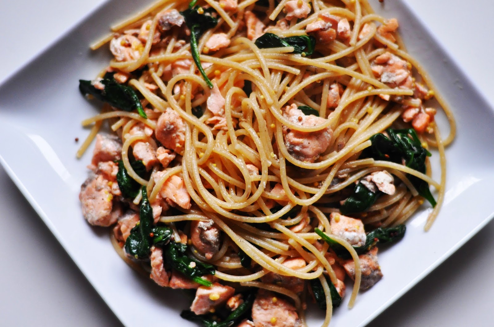 Składniki:100 g makaronu pełnoziarnistego150 g łososia100 g szpinaku2 łyżki musztardy dijonPieprz, sólOliwa z oliwek
