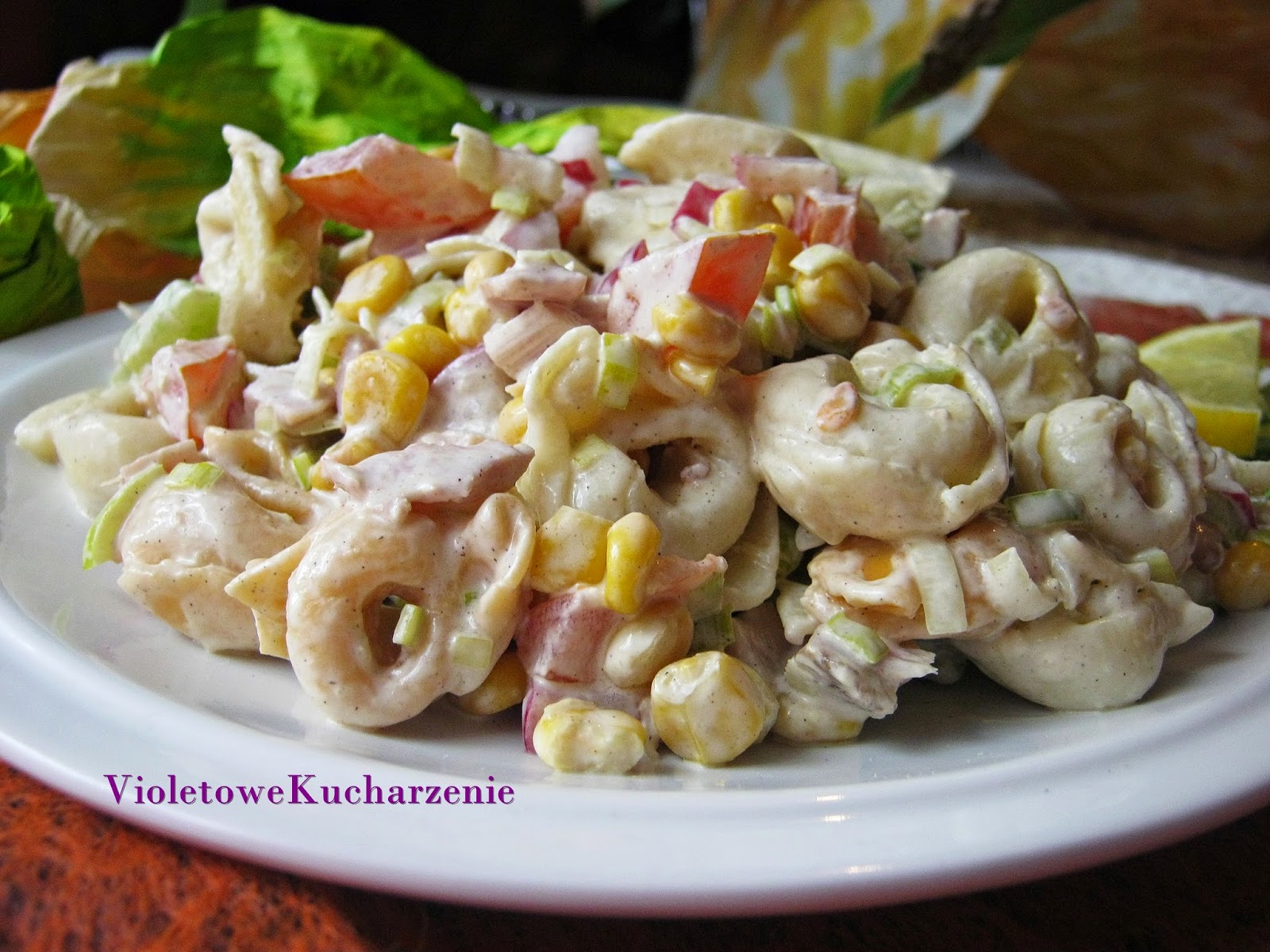 250 g makaronu tortellini z szynką1 udko wędzone1 ogórek2 pomidory1 por (biała cześć)1 pęczek rzodkiewki1 puszka kukurydzy3