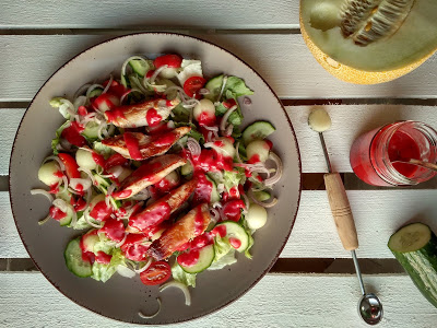 Sałatka z makaronem ryżowym, truskawkami i mango