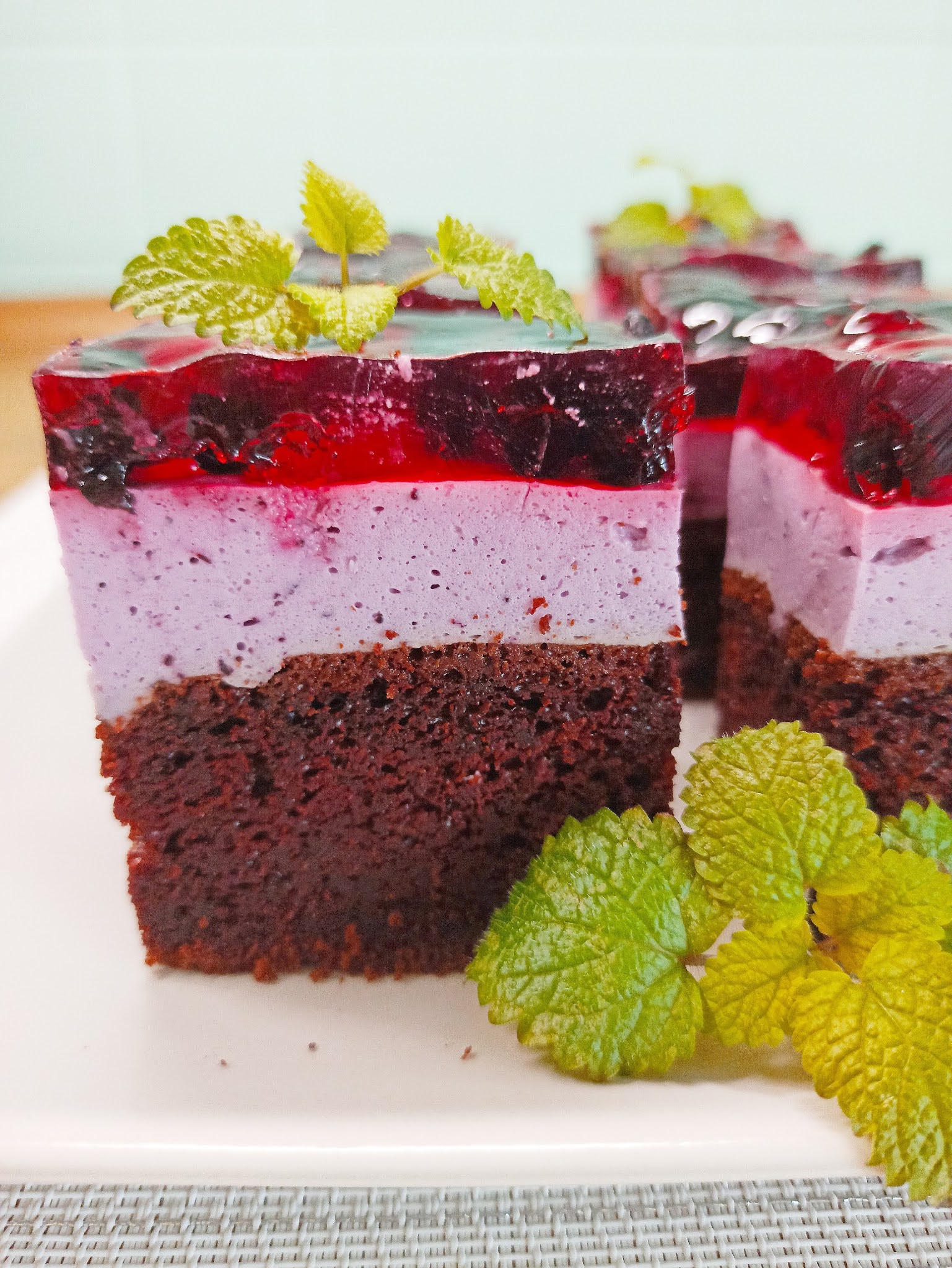 Przepyszne, mocno czekoladowe ciasto z lekkim musem śmietankowo-jagodowym, którego wierzch dopełniają jagody…