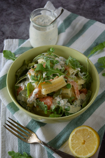 Sałatka makaronowa z łososiem wędzonym, rukolą i zieloną fasolką