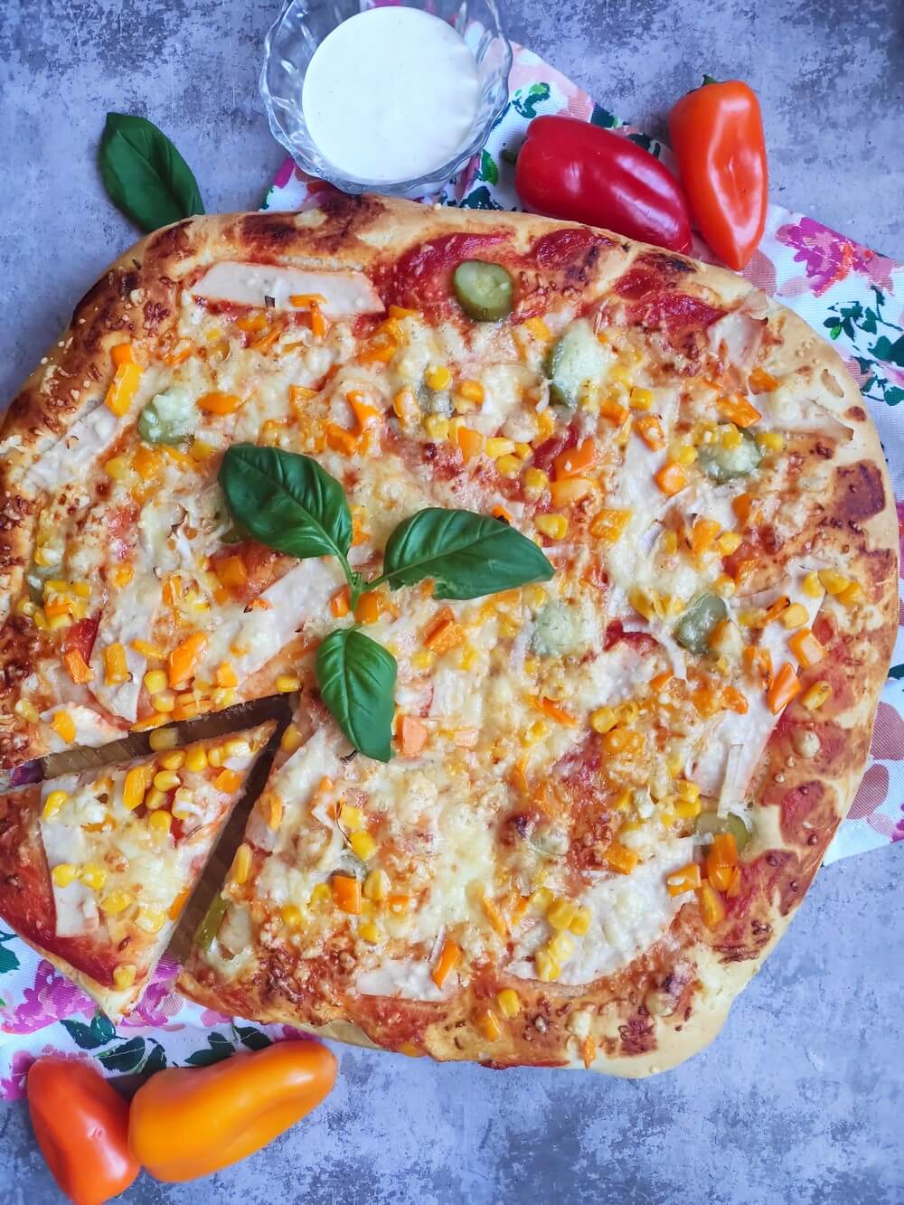 Domowa pizza z kukurydzą, kurczakiem, papryką i ogórkiem Jak wiecie my uwielbiamy…