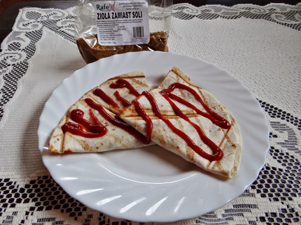 4 placki tortilli 4 plastry szynki4 plastry żółtego sera1/2 koncentratu pomidorowego1 cebulazioła zamiast soli Rafexketchup Cebulę obrać i drobno posiekać. Koncentrat pomidorowy wymieszać z