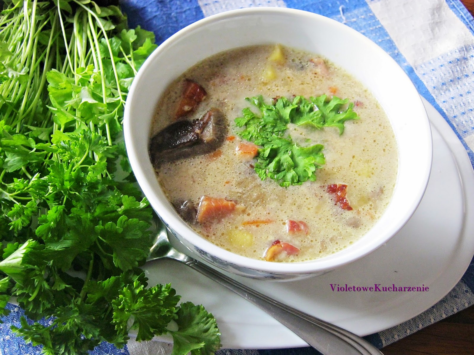Kuchnia kaszubska charakteryzuje się bogactwem lasów, jezior, sadów, łąk i pól. Jest to kuchnia smaczna, sezonowa i łatwa w przygotowaniu. Gospodynie na wszelki sposób próbowały urozmaicić posiłki. Zupa od zawsze była podstawą ciepłych dań. Dzięki hojności runa leśnego w postaci grzybów, powstała taka oto zupa.